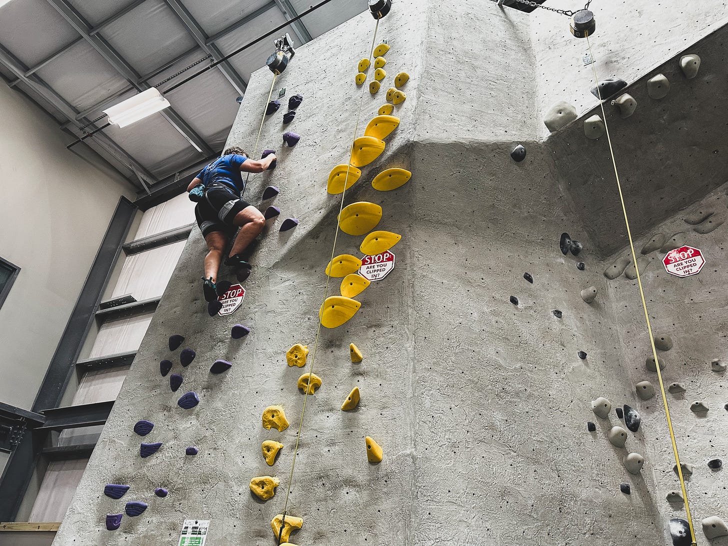 There most of the staff fits into the stereotype. I’ve seen one female staffer so far, but not really interacted with her. The young, male staffers have responded variously to me, from being enthusiastic when I said I’d invested in my own gear, to joking about setting the auto-belay to “assisted climb” when I said something about tightening the one that makes you take a trust fall before it catches. Maybe he would have said that to anyone. Maybe I’m being self-conscious as a solid, almost forty-six year old starting a new hobby.